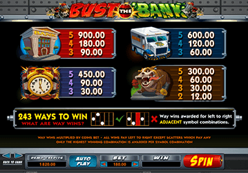 Bust The Bank – игровой аппарат, в котором геймеры станут свидетелями погони полицейских за грабителями банка. Эмулятор пропитан риском, опасностью и драйвом, что удачно подчеркивают его символы: воришки с мешками, полными монет и баксов, коп с дубинкой и девушка-полицейская на машине, инкассаторская машина, бульдог, банк и взрывчатка.