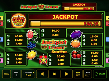 Компания Novomatic очень часто выпускает новые азартные игры, которые особо не отличаются от предыдущих работ ни оригинальностью, ни функционалом. Это никак не смущает данного производителя, поэтому не так давно был выпущен новый игровой автомат Jackpot Crown. Единственным отличием от всех остальных работ является наличие прогрессивного джек-пота.